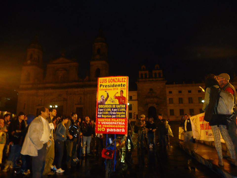 Audazmente, observamos que por la carrera 7 donde asesinaron un 9 de abril al caudillo JORGE ELIECER GAITAN un parroquiano santandereano por demás todos los días sale con una extraña bicicleta donde lleva una bandera de Colombia, con la foto del caudillo popular y consignas contra la reelección de SANTOS (SANTOS QUE NO HACEN MILAGROS SE VAN PA` SU PUTA MIERDA… dice el adagio popular) Y un agudo sonido con eco que retumba en el Palacio de justicia, en la Casa de Nariño, en la Catedral Primada y el Congreso de los corruptos.